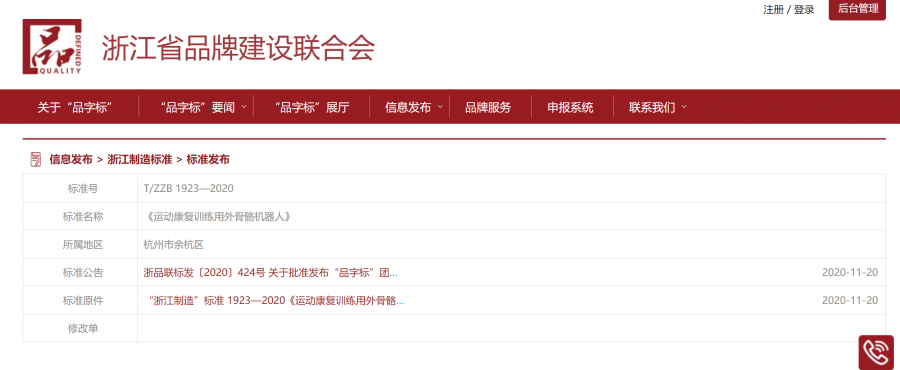 11月26日,《外骨骼機器人》“浙江制造”團體標準在浙江省品牌建設聯合會公開發布。