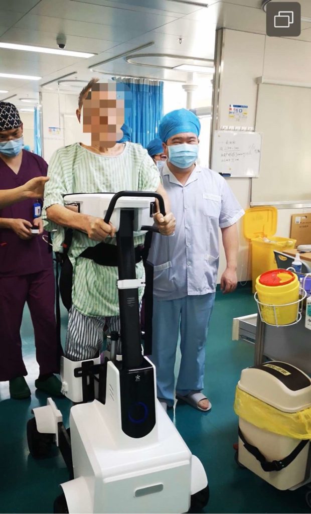 在醫護人員的幫助下,李**每天使用悠扶機器人進行站立訓練。當李**使用悠扶機器人一周后:站立的時間可以持續在10分鐘左右,實時監測血壓心率,未出現明顯波動,體位性低血壓的情況有了改善;經過三周站立訓練,患者肺功能增強,咳痰量減少,少部分可經口排出,下肢肌力達到3+級,患者的情緒和心情都有明顯好轉。